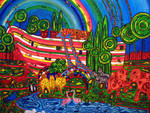 2008De Ark van Noach geschilderd in heel vrolijke kleuren, in een fantasievolle, naieve stijl.